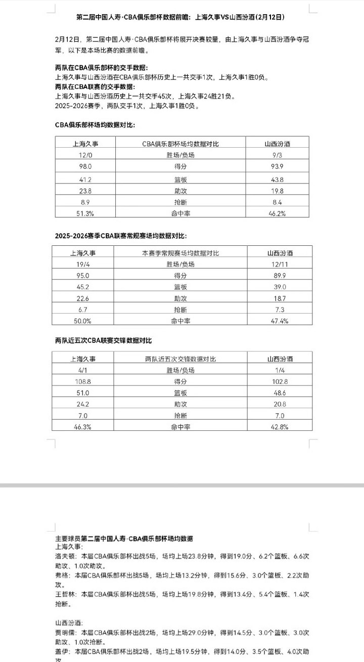 上方截图是上海男篮和山西男篮,在俱乐部杯和常规赛中的交手情况,以及两队目前的战绩,还有各主力球员的具体数据。从纸面实力来看,山西男篮全面落入下风。但篮球比赛不能光看历史数据,数据就能定输赢的话,比赛也就不要打了。